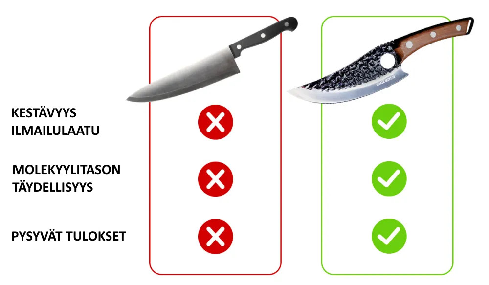 Sitten löysin veitsen, joka oli valmistettu edistyksellisellä kovetusprosessilla, jota käytetään yleensä vain kaikkein kovimpiin työkaluihin. Ensimmäisellä käyttökerralla viipaloin tomaatin paperinohuiksi siivuiksi – täysin vaivatta. Yhtäkkiä ruoanlaitto tuntui helpolta… jopa hauskalta.